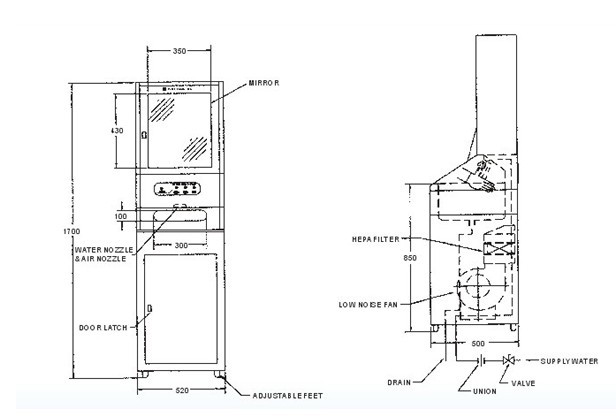 自動給水洗手后, 以自動高速無塵/無菌空氣吹干, 從電子工業(yè)到制藥, 食品, 醫(yī)院, 研究所, 實驗室, 農(nóng)牧業(yè), 生物科技等方面, 其應(yīng)用范圍廣大。